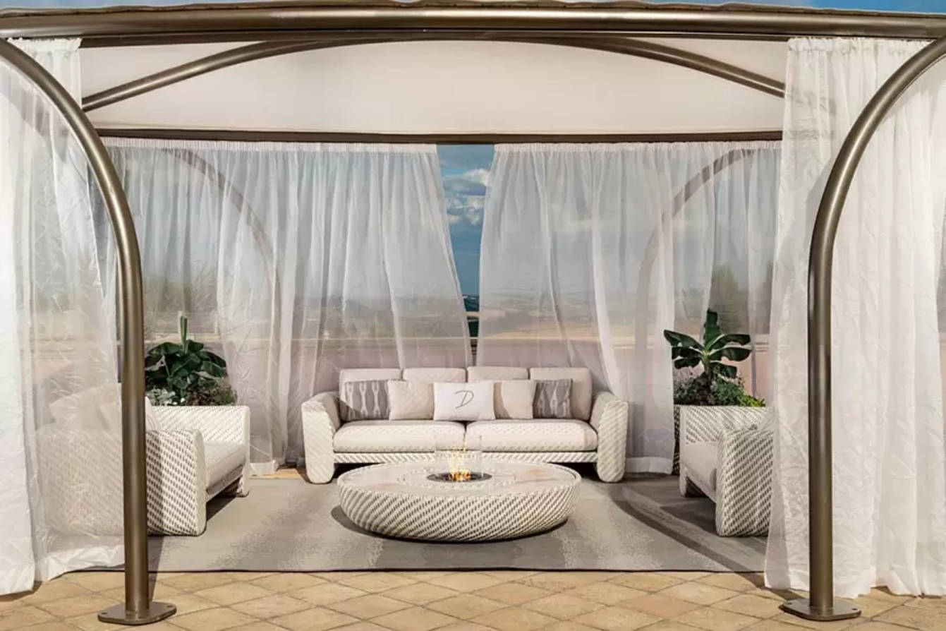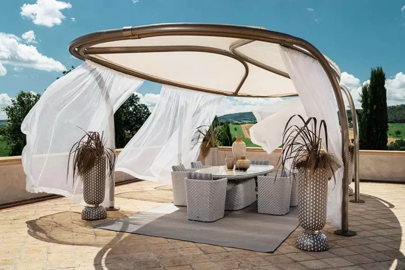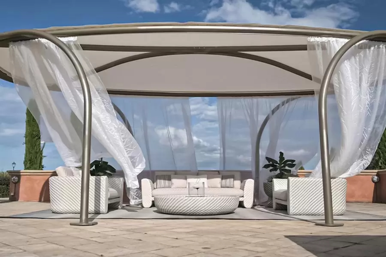 With its sleek curves and delicate fabrics the Sunlight pergola is a stunning element that beautifully enhances your outdoor living space. From the base to the roof, rounded elements characterize this unique structure that conveys exquisite elegance despite its significant dimensions.