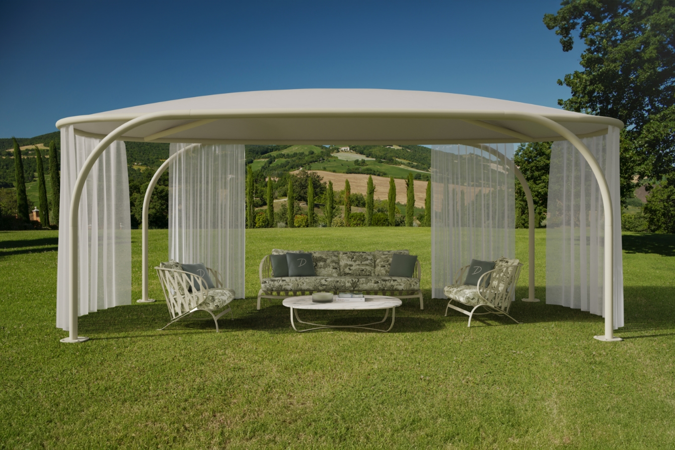 The lightweight cover and airy drop cloths complement the sturdy steel structure and create an intimate welcoming ambience to live the outdoors in comfort and style. This unusual gazebo iis made in steel and can be realized in custom sizes.