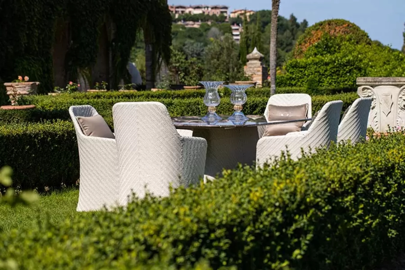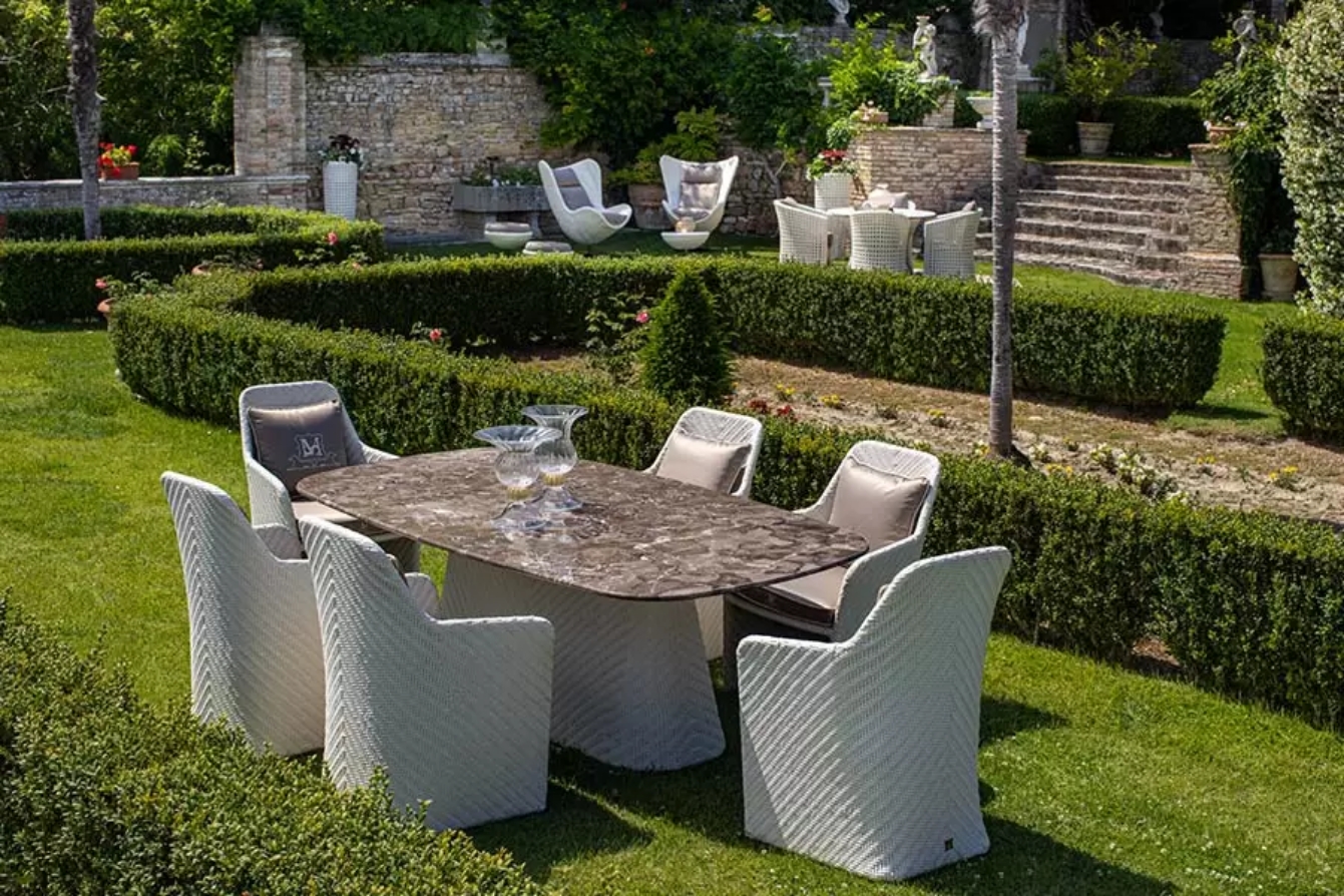 The dining kenzia proposal consist of an elegant bridge with an extremely sophisticated manifacture made of woven synthetic rattan that draws a compact texture and creates a highly elegant material game. The base of the table has a trapezoidal shape where can be placed different types of tops.