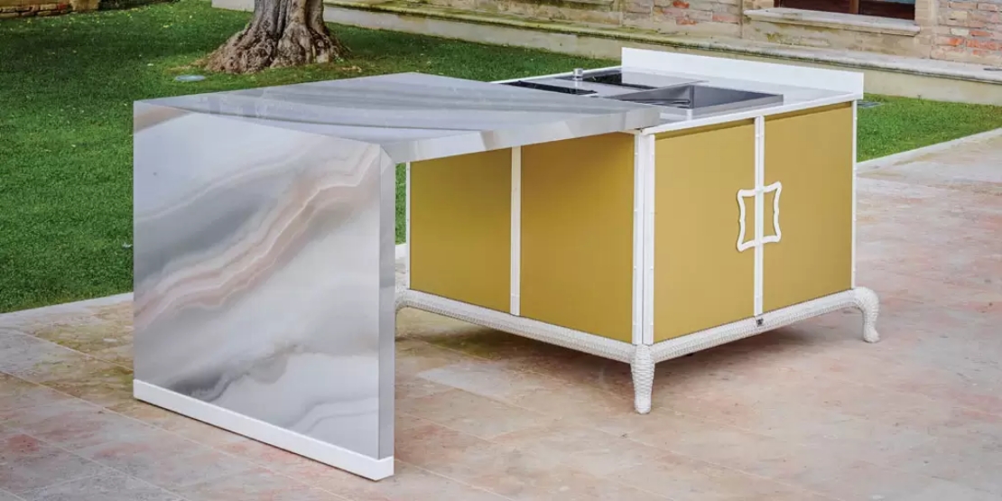 One highly functional item that takes care of all the prerogatives that characterize the collection. Unique shapes, precious details, unusual finishes, cutting-edge technology, these are the ingredients for a kitchen designed to pave the way for new trends in outdoor luxury furnish. On request the kitchen can be also realized with provisions for client’s own appliances. In addition of this the kitchen can be provided with client’s favorite brand equipments. All the kitchens are perfectly coordinated with the furnishing element by Samuele Mazza Outdoor Collection.
