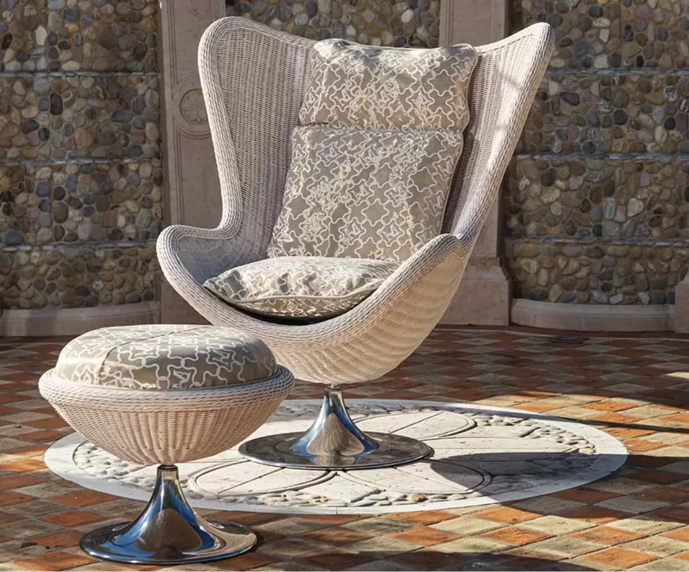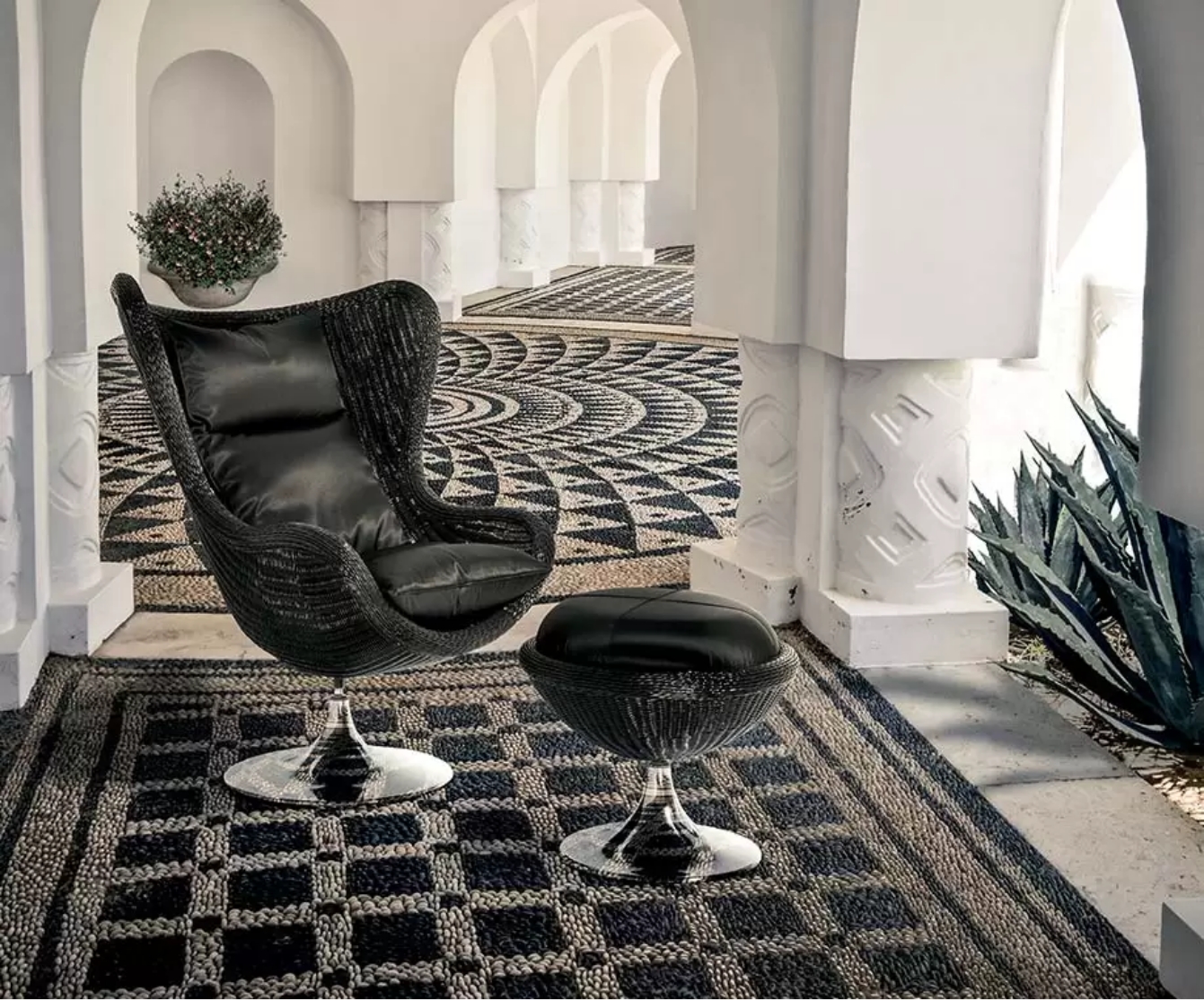 The Aldebaran lounge chair pays tribute to a famous chair that has been acknowledged as a legend of international design for over half a century. It has been reinterpreted by our designer with slightly larger dimensions and covered with a dense weave of wicker, which creates a compact and continuous surface that is very pleasing to the touch. The seat has been dressed in soft, embracing cushions. The base swivels, as per the original, but is chrome plated and cone shaped. It is a unique piece from the collection, which also includes a foot stool and low table. The Aldebaran lounge chair is a generously sized and comfortable chair, distinguished by an all-embracing design that offers users comfort and privacy.