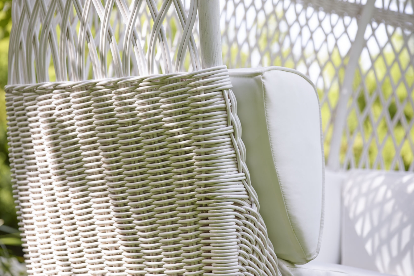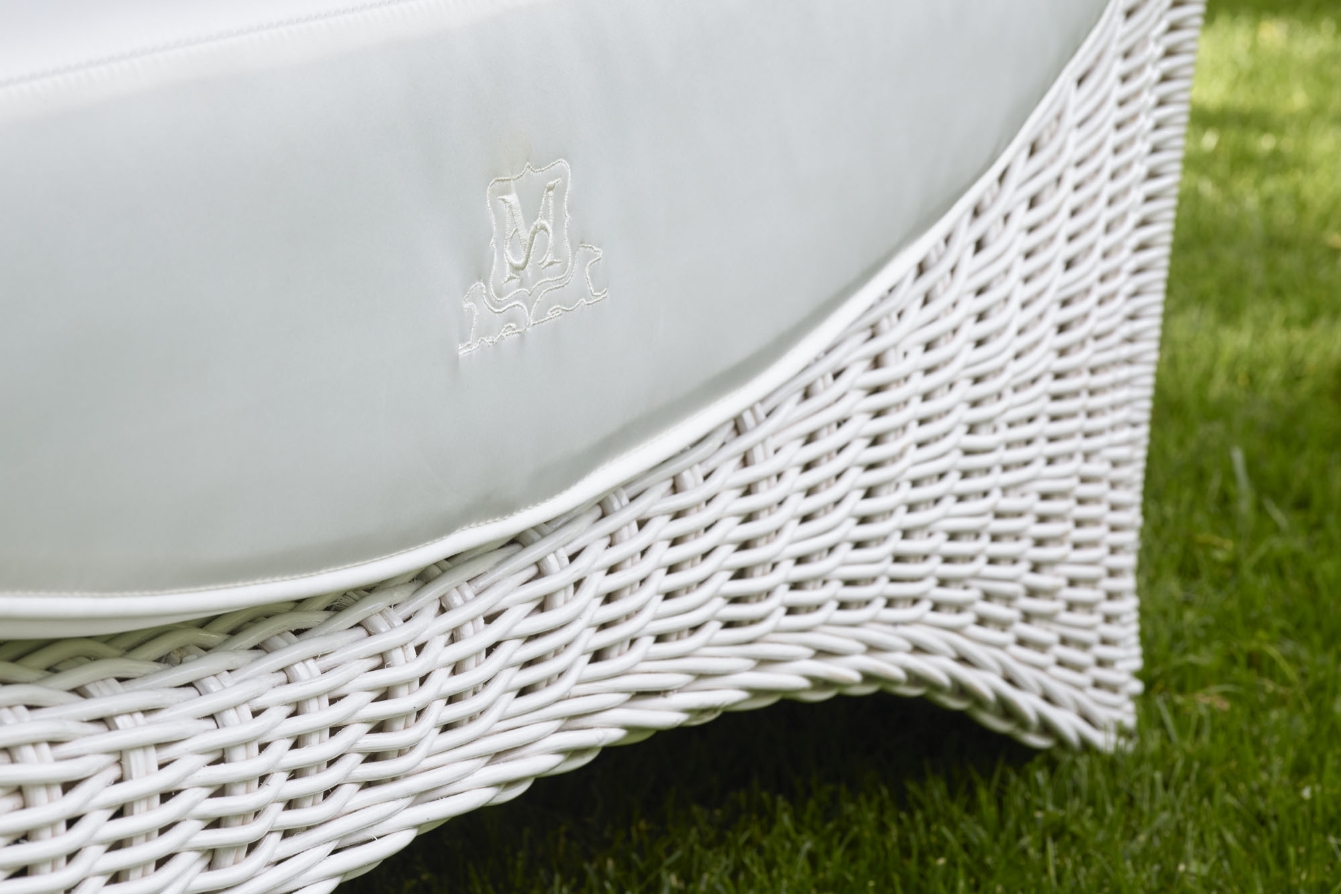 An extremely distinctive and unique piece that is circular in shape. The frame is made entirely of rattan. The weave is dense and compact in the lower part of the structure, becoming wider as it progresses upwards, creating a pattern of diamonds forming a shell around the seat. The seat is welcoming, with soft and inviting cushions for the utmost comfort. The Altair bench has a reduced depth, making it ideal for terraces or long passageways where space is limited. It can easily be combined with elements from the Vega series, which uses the same weave, and is ideal for use in a wide variety of contexts as a distinctive element with a classic, yet glamorous design.