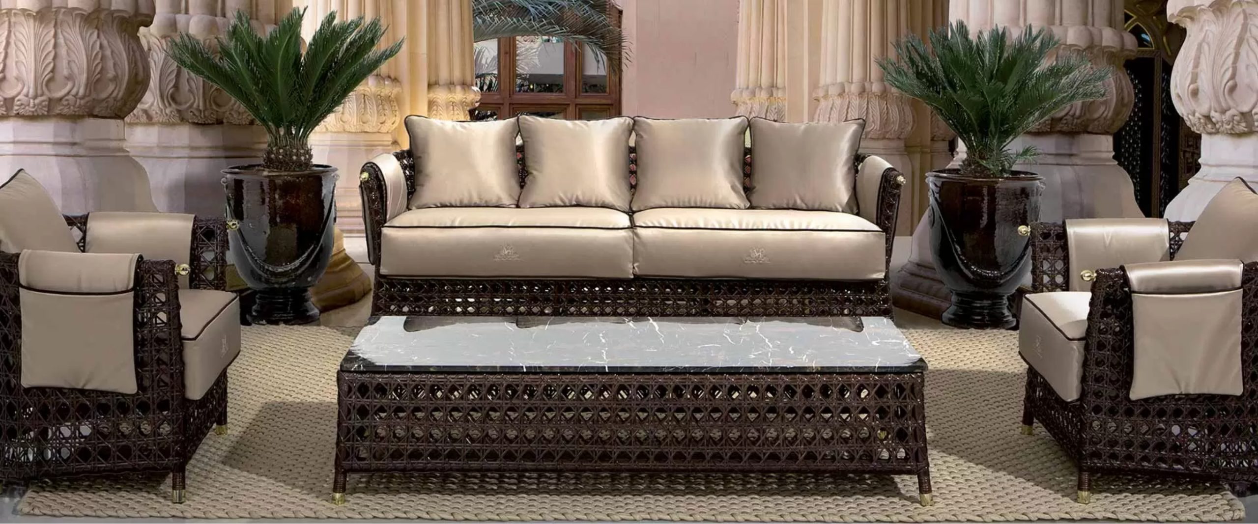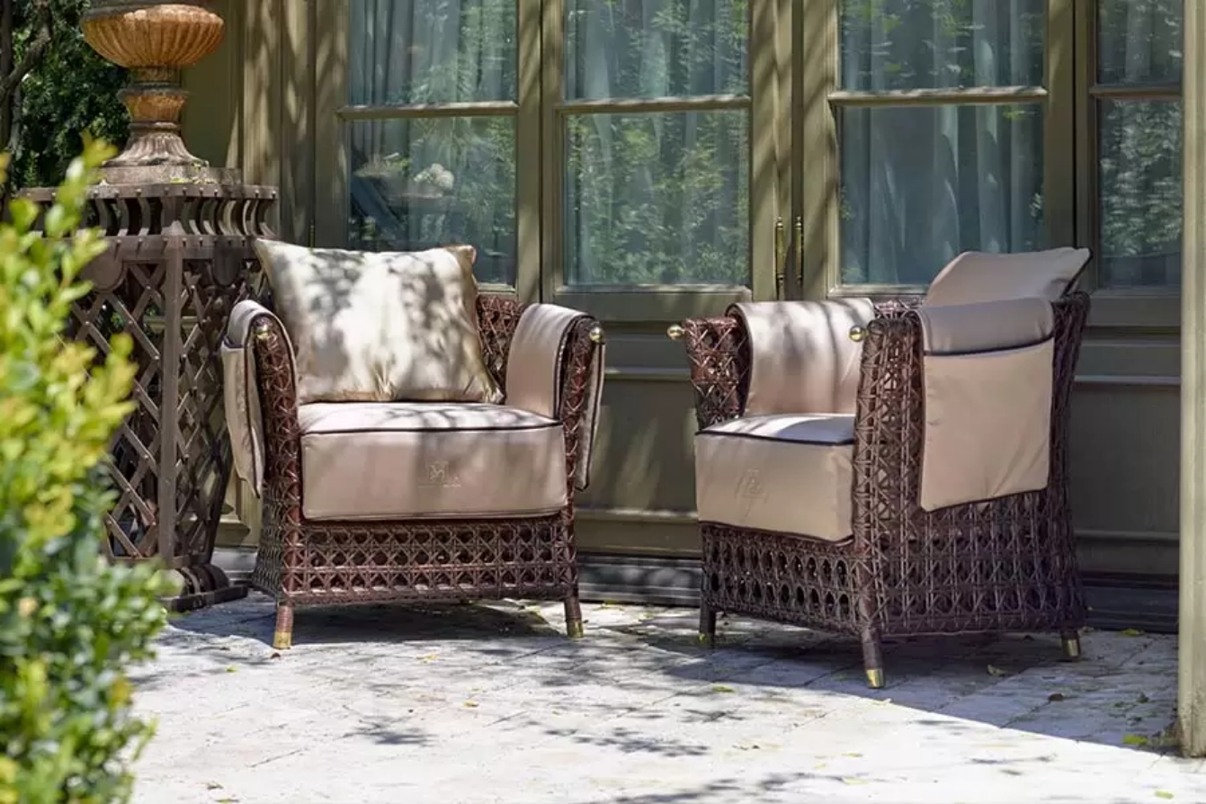 The Rigel range is the version made with the same woven vellum as the Wezen range and follows the same design. Natural vellum is carefully selected and processed with a long and meticulous process, which is performed exclusively within the company by expert master artisans. This range also reflects and pays tribute to a great classic of curved wooden furniture from the past: Vienna straw. The traditional design distinguishing this material has been reinterpreted with a touch of luxury and is the star of the show for a range of elements with a classic, yet glamorous design. The iconic weave is created using the finest vellum and is proposed in an oversized version creating ample textures and transparencies that embrace the furnishings, combined with the finest details such as chrome-plated feet and knobs and storage pockets. This particular weave is an extremely complex piece of work that, as for all furnishings from the Samuele Mazza collection, is performed exclusively by hand. A complete range of products is offered to meet every need: sofas, dining tables, sunbeds, foot stools, lights and much more.