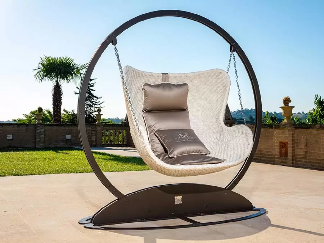 Swing chairs are synonymous with relaxation, capable of evoking fascinating and harmonious atmospheres. This swing chair is inspired by and takes the shape of the iconic Aldebaran armchair, further expanding the concept of comfort in a glamorous key. The synthetic resin frame, strictly hand woven, has the shape of an ample and comfortable seat: a nest in which to indulge in a little self-pampering. The overall image is enhanced and made original by the external supporting structure: an iron circle representing a real frame in which the swing chair is suspended. A delicate balancing act of essential-line volumes which maintain an important and sophisticated scenic presence.