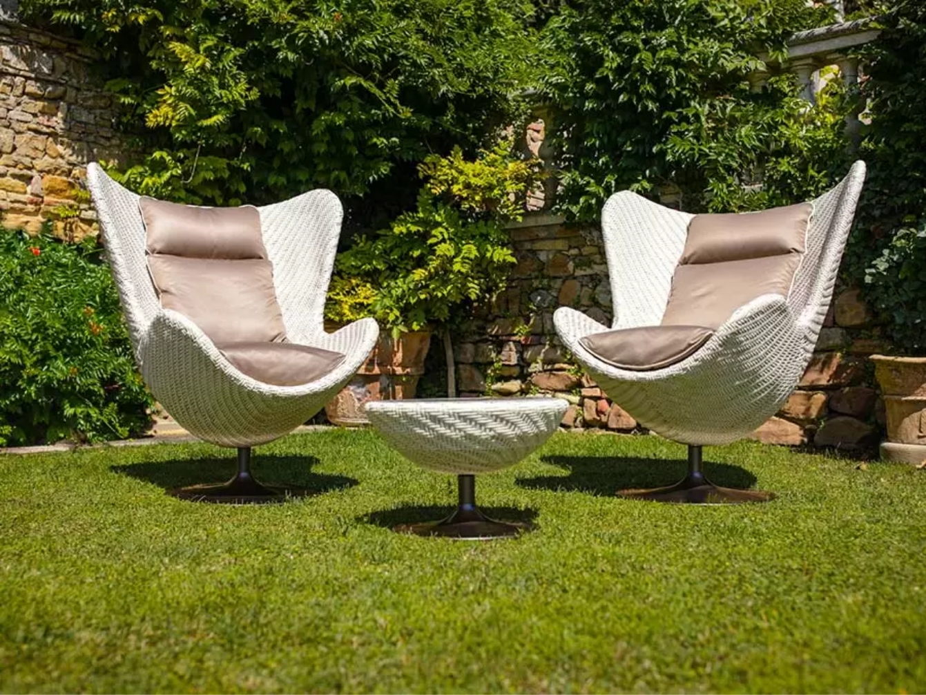 Inspired by iconic lines of international design, Samuele Mazza thinks of an unusual relaxation area with great character. The Aldebaran family, fully expressing the idea of comfort in a glamorous key. The series consists of an iconic swing chair and a relax armchair to be combined with pouf and coffee table for an original and harmonious set: a real open-air living room characterized by the charm of innovative lines and proportions. Soft cushions and enveloping lines become the ideal place to indulge in moments of pure relaxation. The structures are made of synthetic resin, strictly woven by hand and suitable for outdoor use. All the furnishings of this family recall the idea of ​​generous comfort.