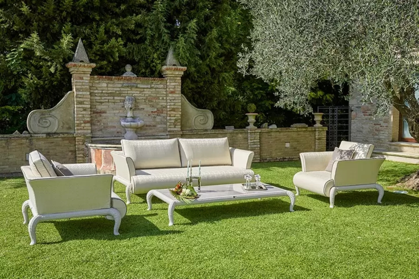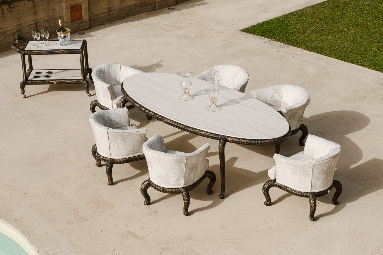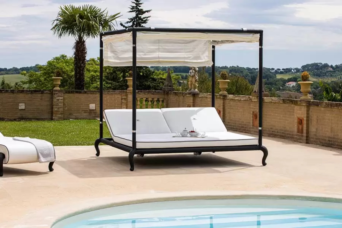 The furnishings from the Canopo range stem from a dreamlike inspiration: giving rise to furnishings with a strong dramatic impact, which combine imposing aesthetics with convenience and ease of use. The leg is the most distinctive part of the design of every piece of furnishing in this range. An element that is obviously classical in style, but at the same time has some distinctly feline traits. This iconic detail is combined with large cushions formed into soft shapes enveloping almost the entire structure. This vast range of furnishings meets every need for the use and decoration of an outdoor space: sofas, dining tables, chairs, console tables, sunbeds, canopy beds, lights, food trolleys and bioethanol fires. In addition to furnishings, accessories and lighting, the range also includes outdoor kitchens with the same distinctive leg design. With items from the Canopo range, there are no limits to the creation of a sophisticated and complex design for a total look that is fully coordinated in every detail. In contrast to the sophisticated and glamorous appearance, the furnishings in this range are made with materials that permit prolonged use outdoors, as are all of the elements from the Siderale collection. Aluminium frames covered in hand-woven synthetic resin that is resistant to weather conditions, water-repellent fabrics and waterproofed cushions. Often used in combination with elements from the Sole collection.