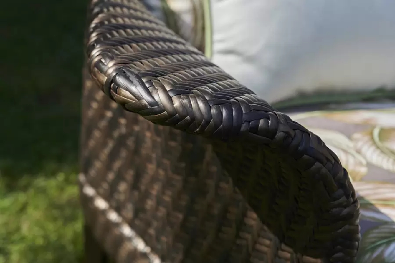 La serie Aralia è realizzata con una struttura in resina sintetica rigorosamente intrecciata a mano con una texture spinata che richiede una meticolosa lavorazione. I piedi sono a vista, realizzati in metallo ed hanno delle finiture particolari in linea con il carattere glamour di ogni elemento che nasce dalla creatività di Samuele Mazza. Le cuscinature sono generose e morbide, invitano ad una seduta informale e utilizzano pregiati tessuti idrorepellenti ed antimacchia. La serie prevede divani componibili, poltrone, tavoli, dormeuse, pouf, ecc., per realizzare un outdoor living completo in ogni dettaglio che sia resistente agli agenti atmosferici. Aralia è un prodotto di alta qualità, pura espressione di un lusso sofisticato, mai ostentato, che genera emozioni e ricrea atmosfere che riflettono i vostri gusti personali e una sensazione internazionale.