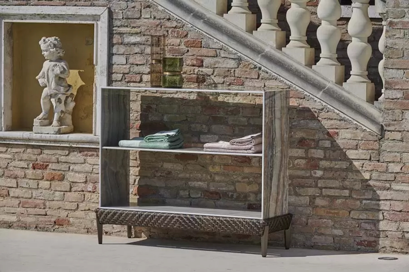 Il vaso diventa connubio perfetto tra monumentalità e modernità: dimensioni importanti e presenza scenica acquistano un look più fresco e contemporaneo grazie alla linea pulita ed essenziale. Interamente realizzato in ceramica, è disponibile in diverse varianti per inserirsi al meglio in ogni ambiente. La consolle della linea Laurus presenta anch’essa un design sobrio e contemporaneo, impreziosito dall’effetto marmo della sua finitura. Ulteriore elemento distintivo è la base che riprende il motivo iconico delle collezioni Samuele Mazza: realizzata in fettucce di resina sintetica intrecciata a mano, crea un sofisticato contrasto con l’intera struttura per un complemento d’arredo in grado di sposare armoniosamente gli stili più diversi con personalità e gusto.