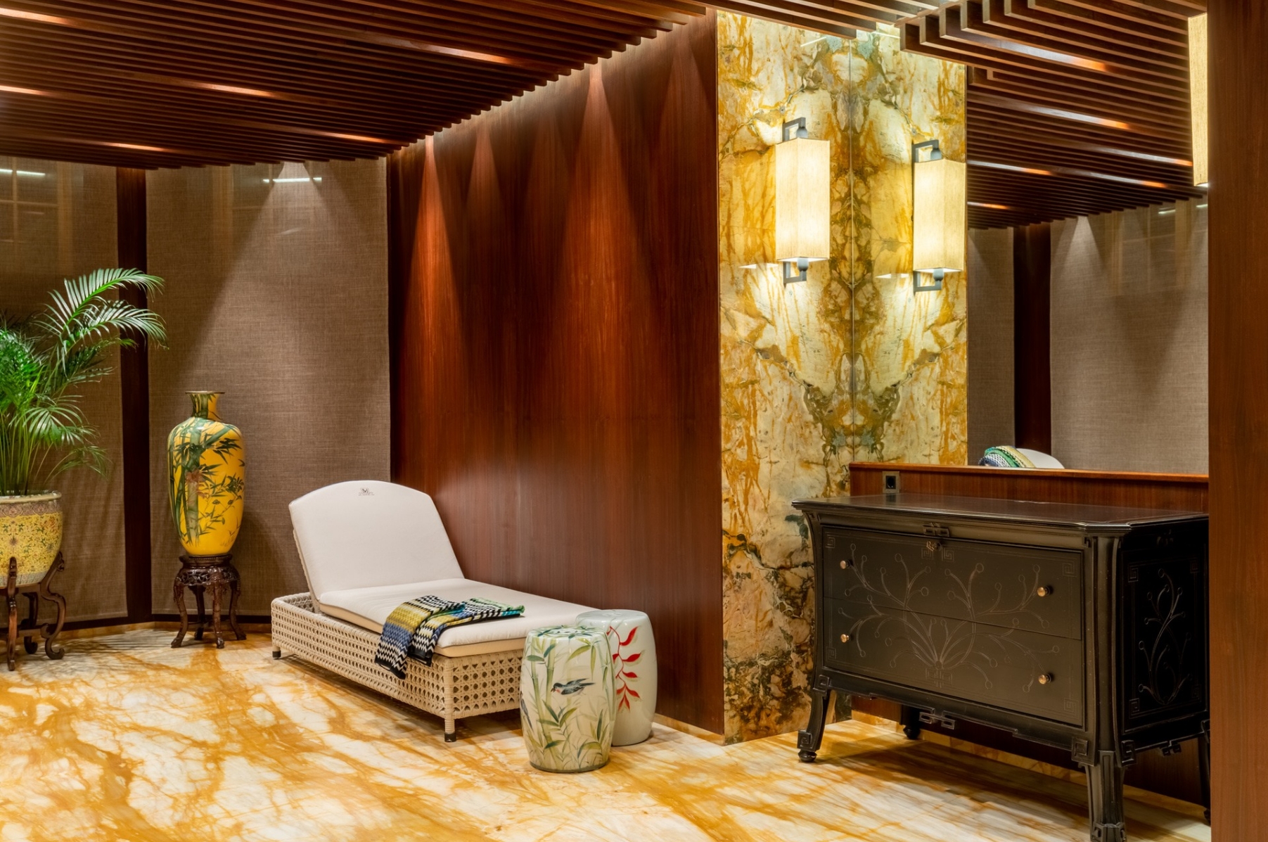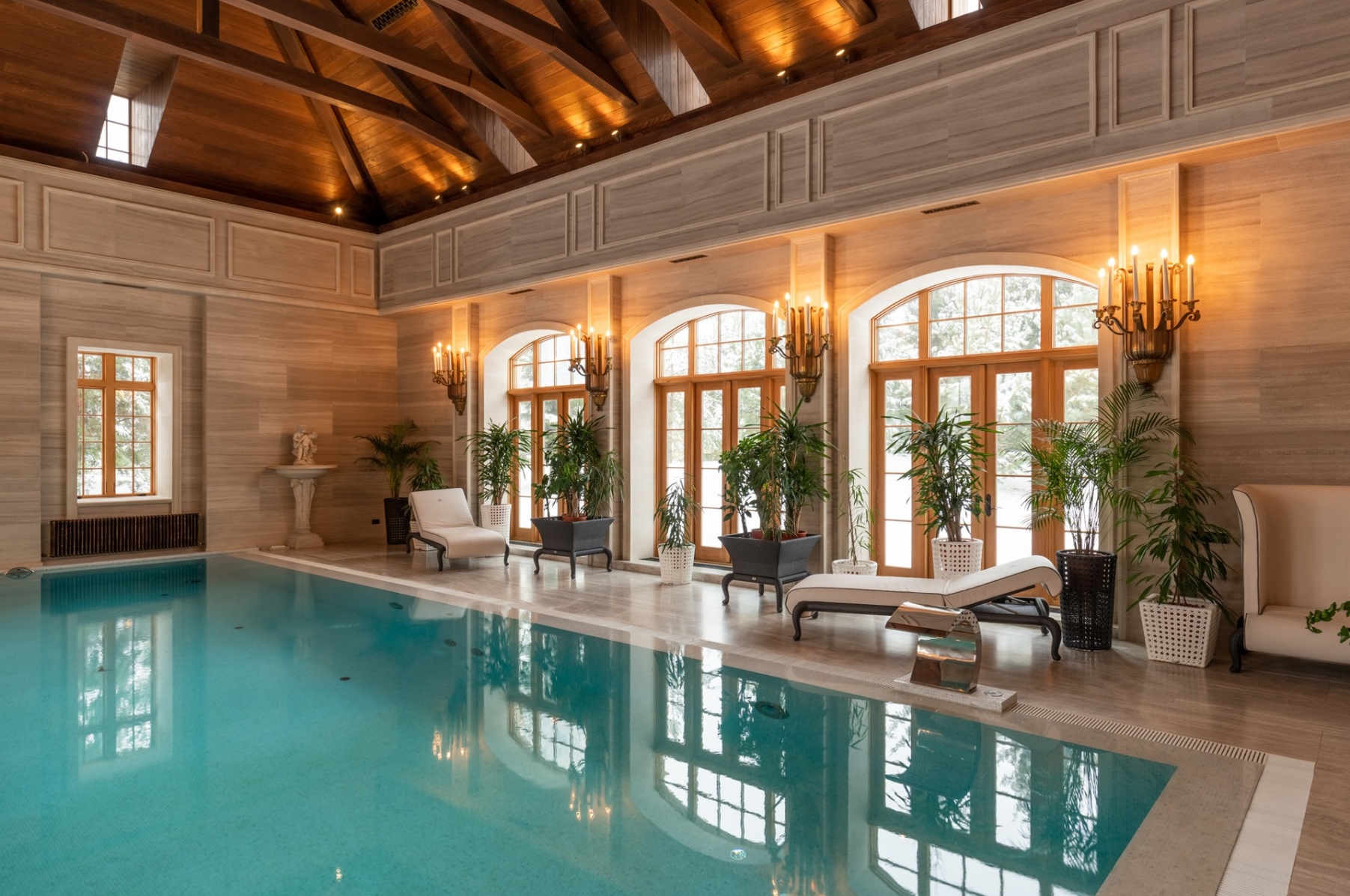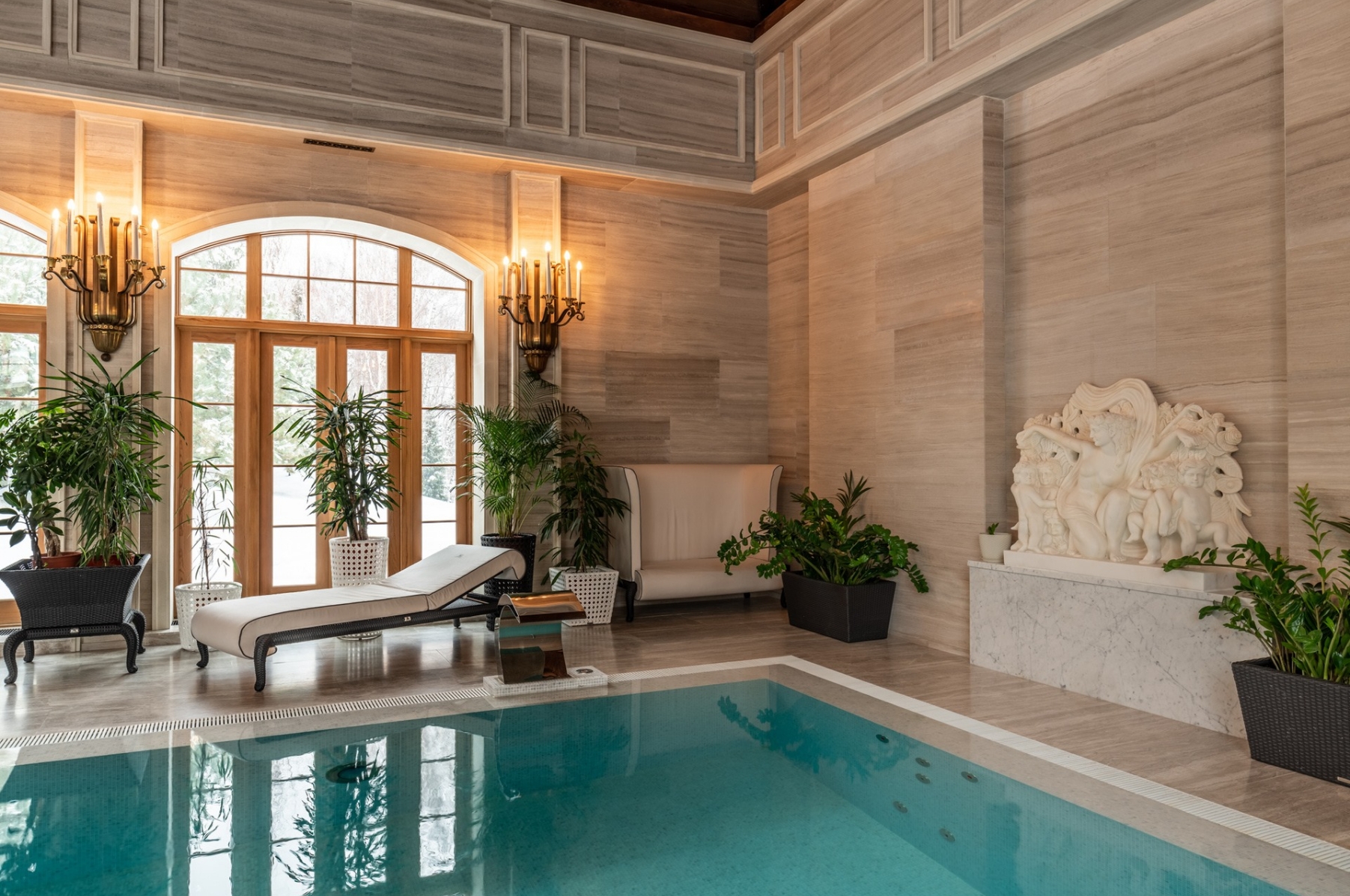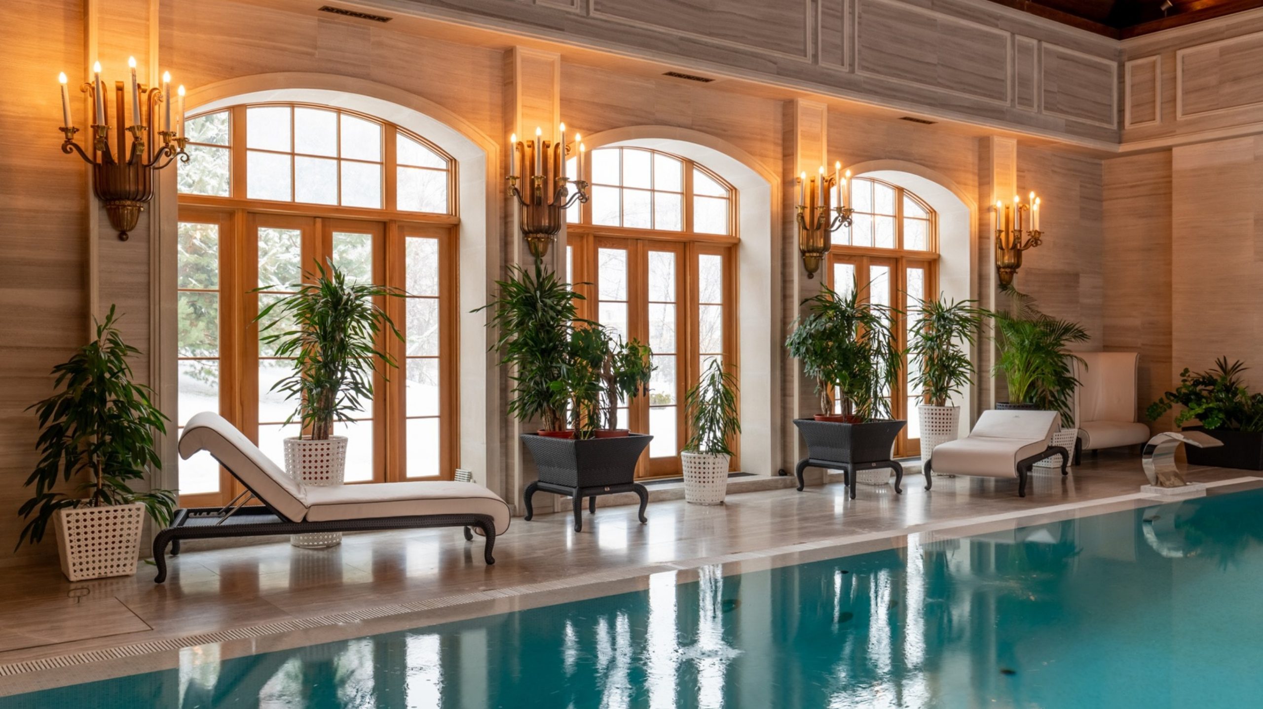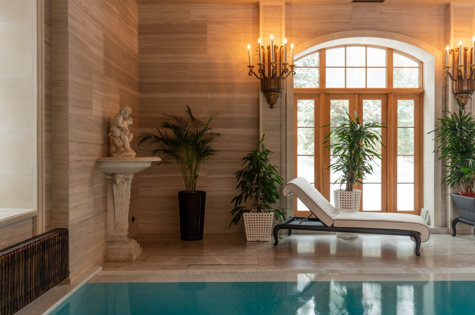 Una piscina interna con ampie finestre collegata a una zona relax dai colori vivaci che richiama riferimenti stilistici orientali. I lettini delle linee Canopo e Wezen, selezionati dalla Samuele Mazza Outdoor Collection, si inseriscono senza sforzo in questo contesto elegante e sofisticato, contribuendo all’estetica generale con il loro carattere deciso.