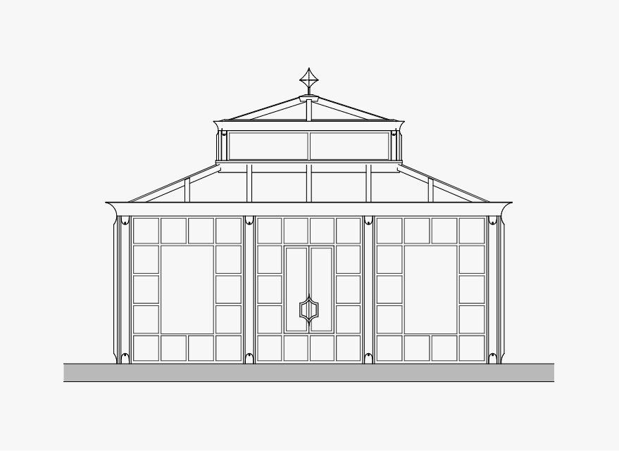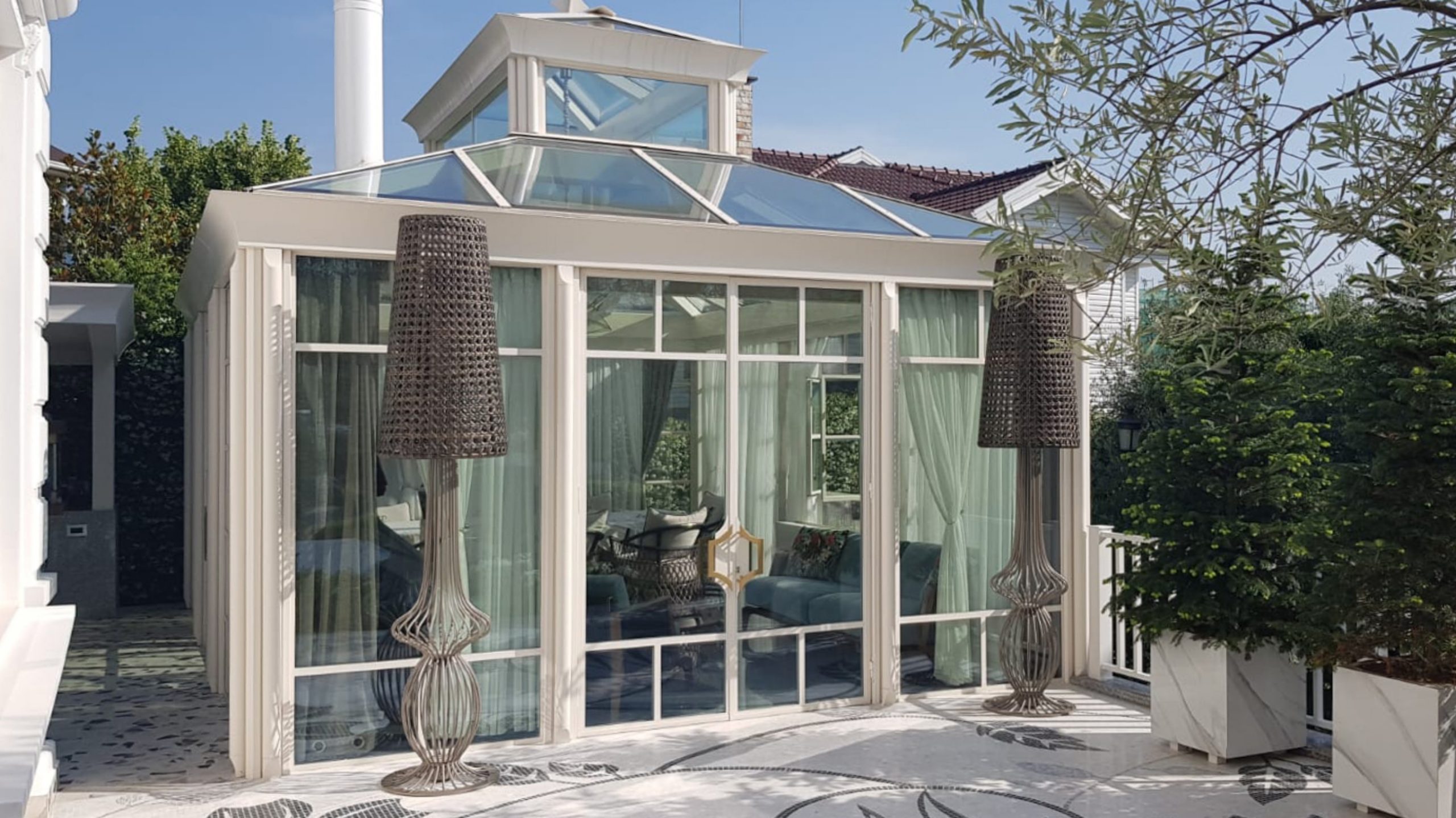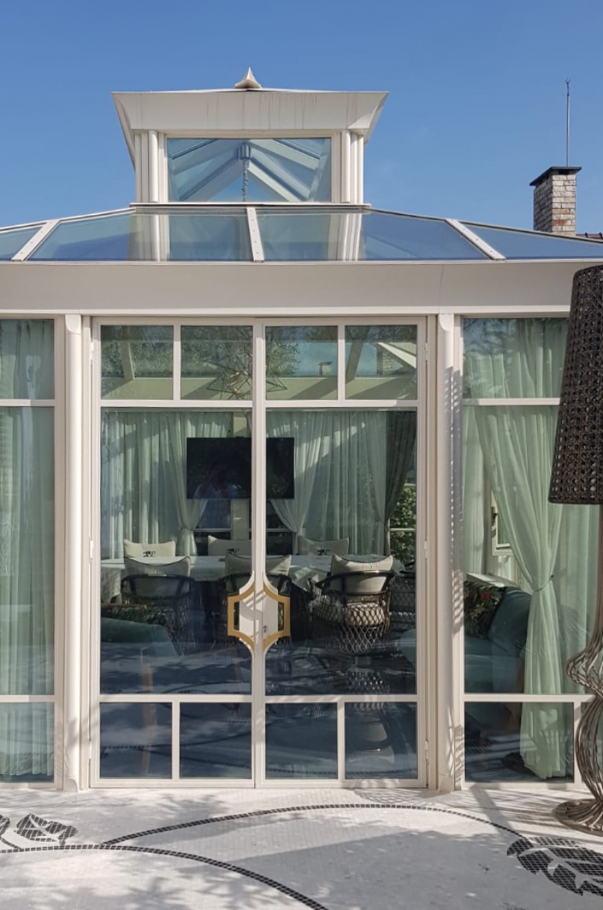 Una struttura a pianta quadrata con una lanterna centrale posizionata sulla terrazza di una casa. Un lavoro accurato e minuzioso, realizzato interamente in vetro e ferrofinestra. Nella struttura è evidente un’ispirazione classica, con elementi decorativi come la cornice e le colonne rotonde con capitelli. Le finestre sono ampie e generose, ma non completamente libere, con profili sottili che formano forme geometriche ripetitive. Una vista preziosa, con la sua struttura armoniosa e linee geometriche.