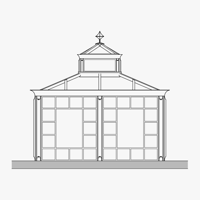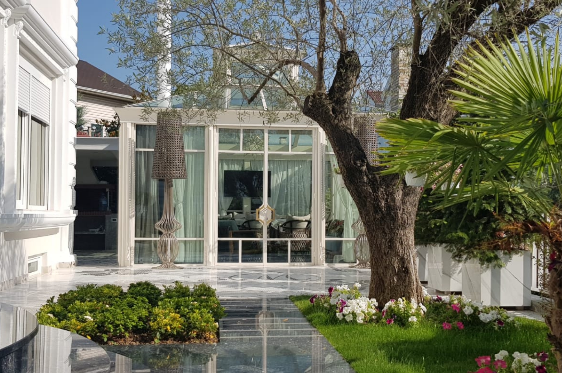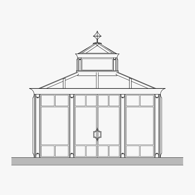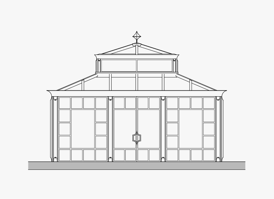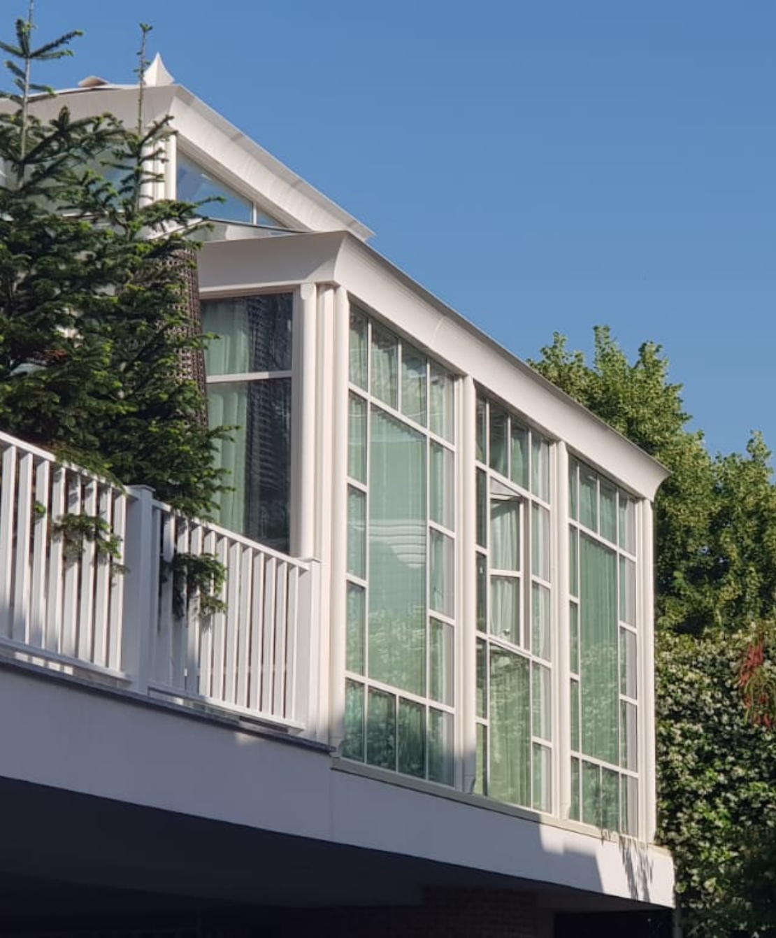 Una struttura a pianta quadrata con una lanterna centrale posizionata sulla terrazza di una casa. Un lavoro accurato e minuzioso, realizzato interamente in vetro e ferrofinestra. Nella struttura è evidente un’ispirazione classica, con elementi decorativi come la cornice e le colonne rotonde con capitelli. Le finestre sono ampie e generose, ma non completamente libere, con profili sottili che formano forme geometriche ripetitive. Una vista preziosa, con la sua struttura armoniosa e linee geometriche.