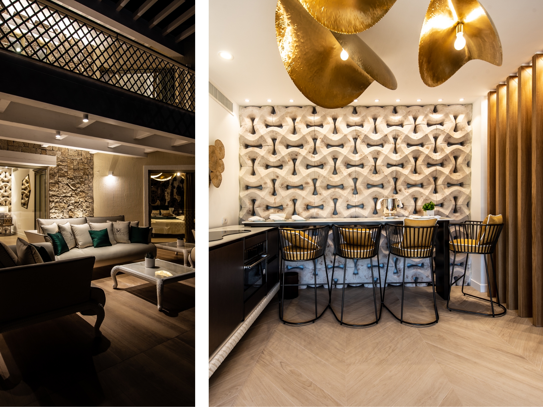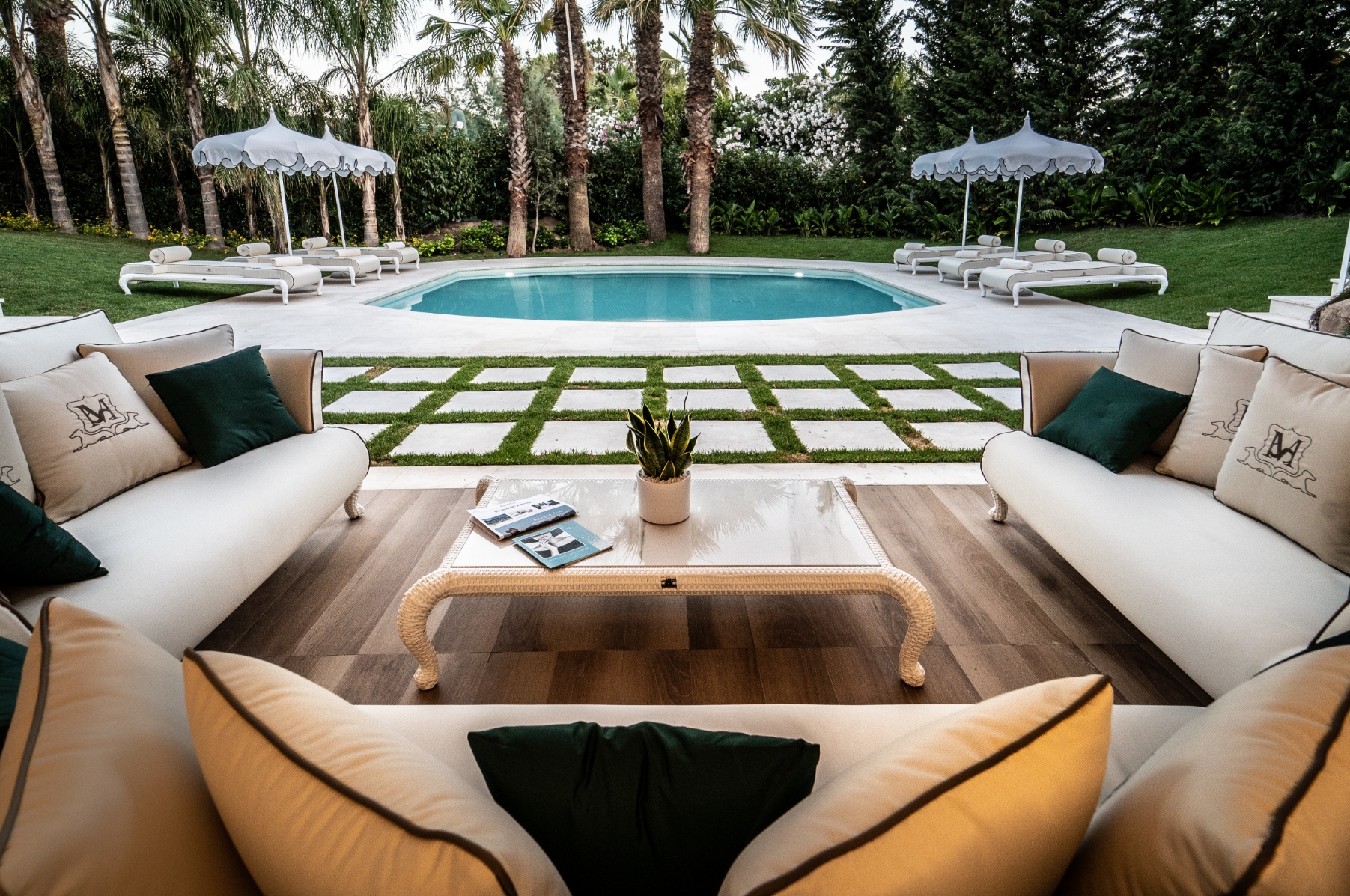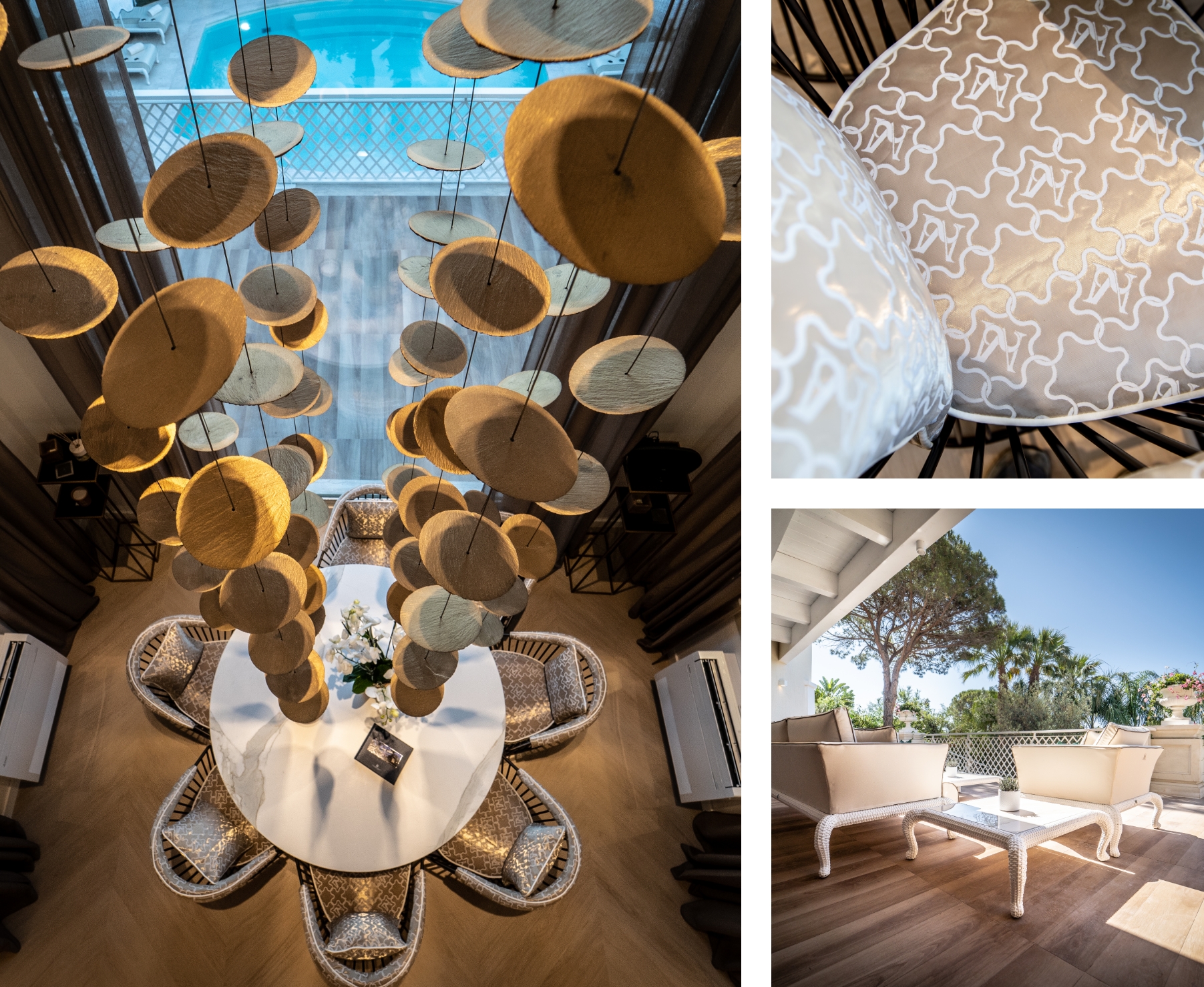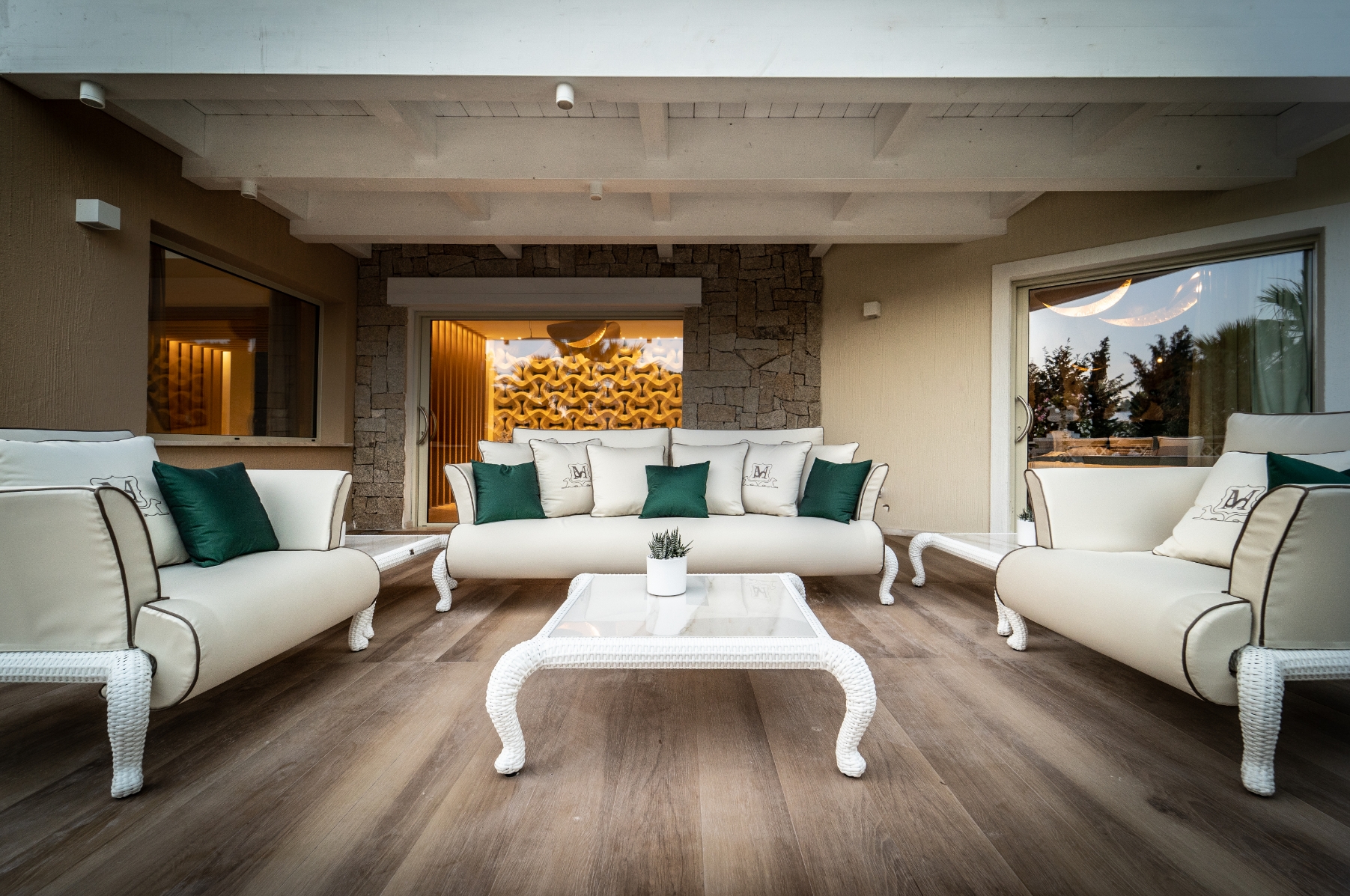 La Villa Forte Village incarna il lusso e l’opulenza, ed è per questo che è stata scelta la collezione Samuele Mazza, prodotta e distribuita da DFN, per arredare l’esterno e alcune aree interne. In particolare, la linea iconica Canopo è stata integrata nell’area piscina per esaltarne ulteriormente l’atmosfera lussuosa. Per completare l’ambiente, lettini e divani sono stati rivestiti con un esclusivo tessuto satinato da esterno di colore oro.